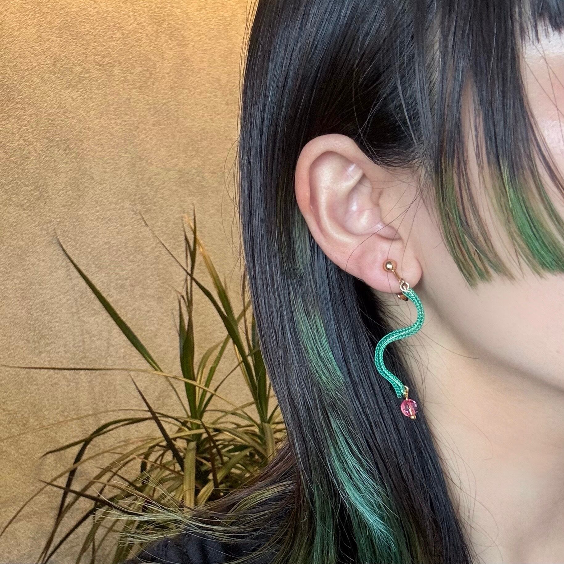 ナイロンの糸がチューブ状に編まれた特殊な素材を使用した耳飾り。