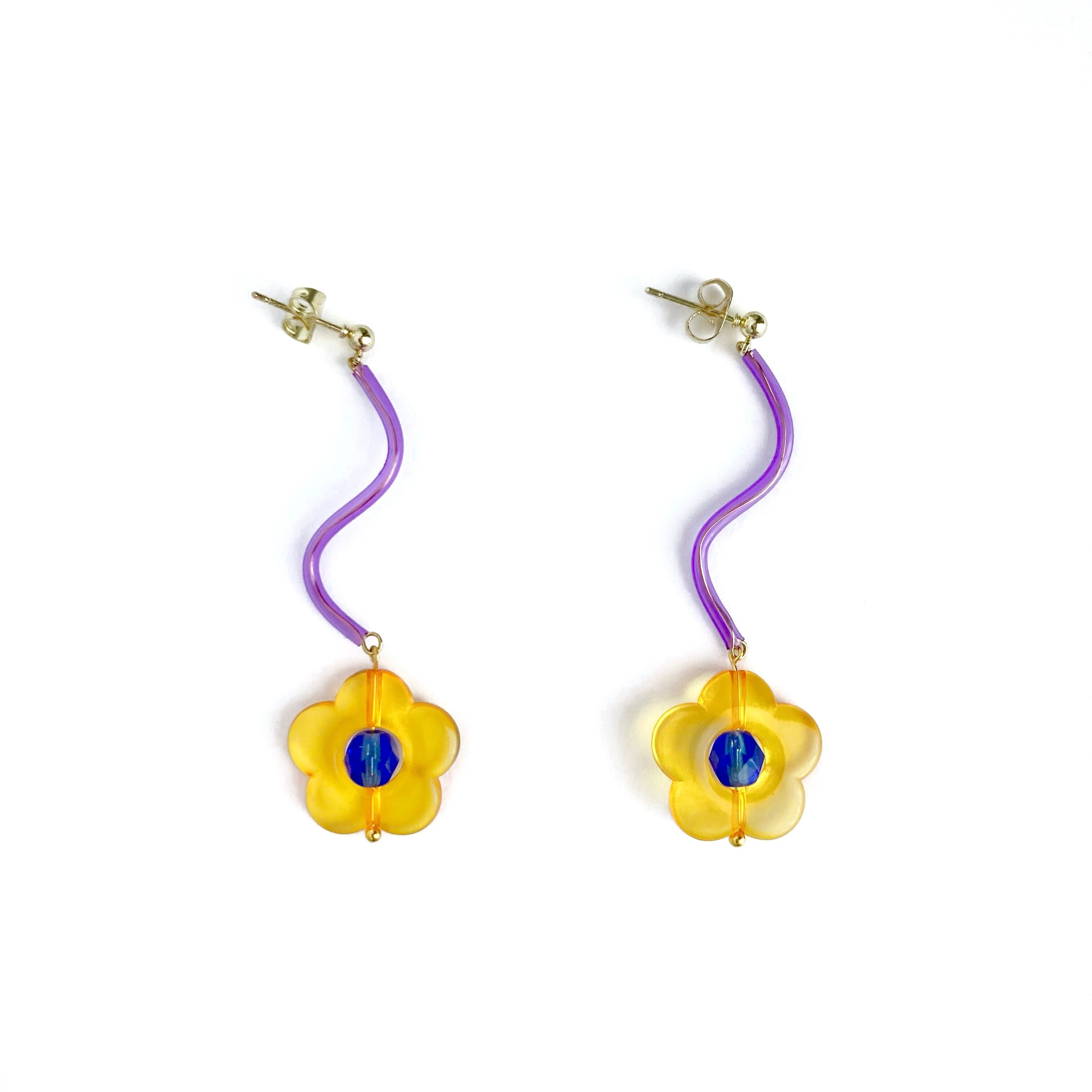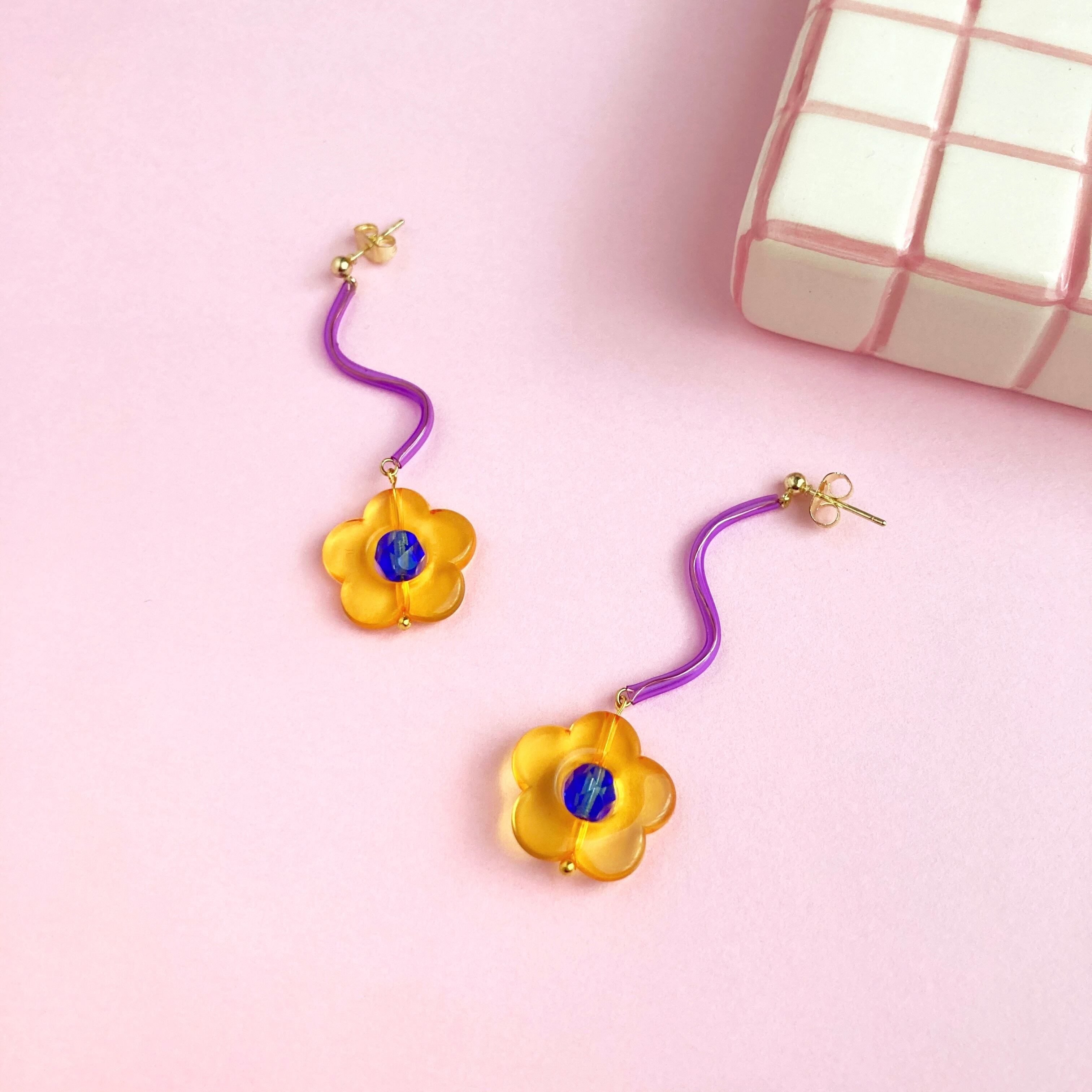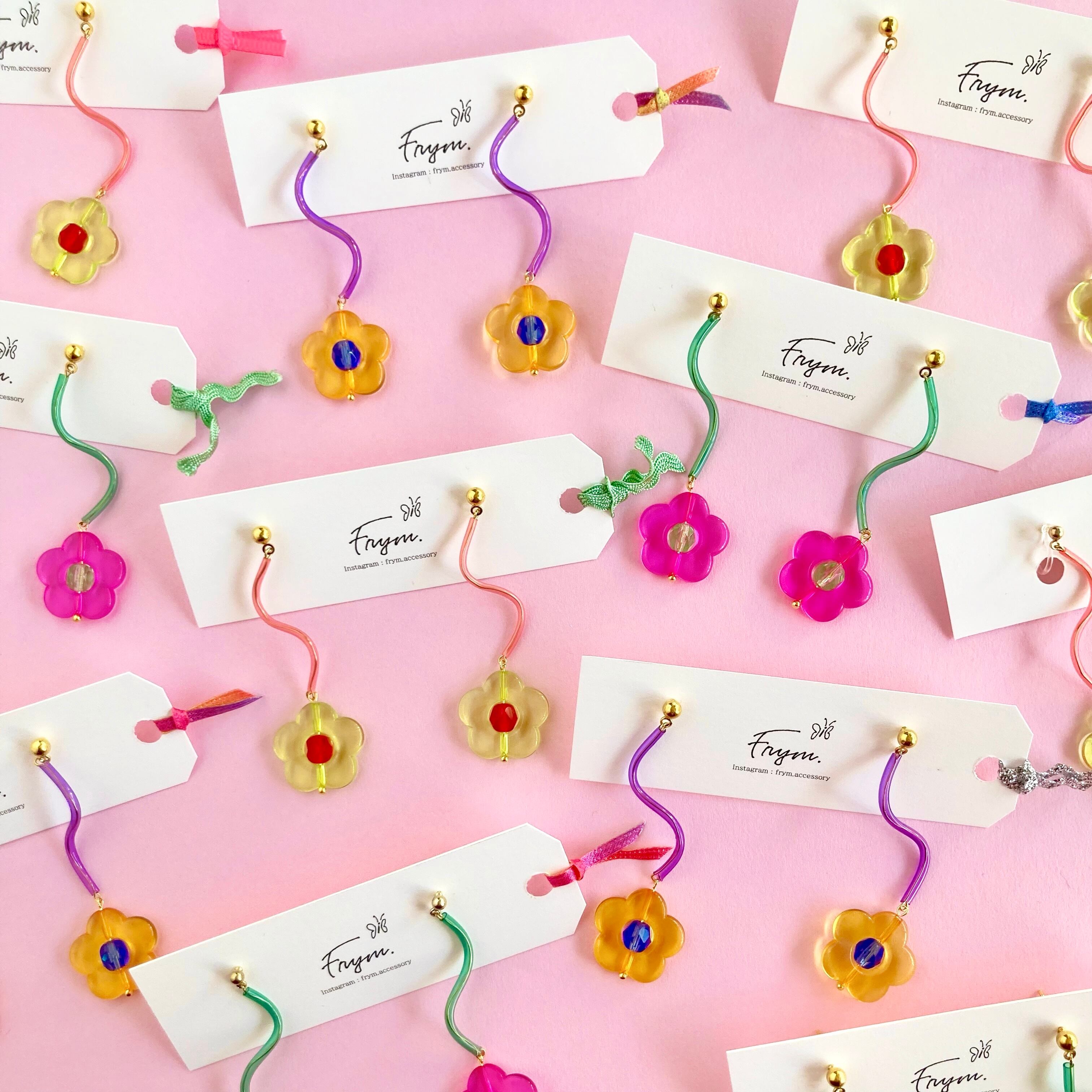 大ぶりなアクリルビーズのお花がぶら下がった耳飾り。