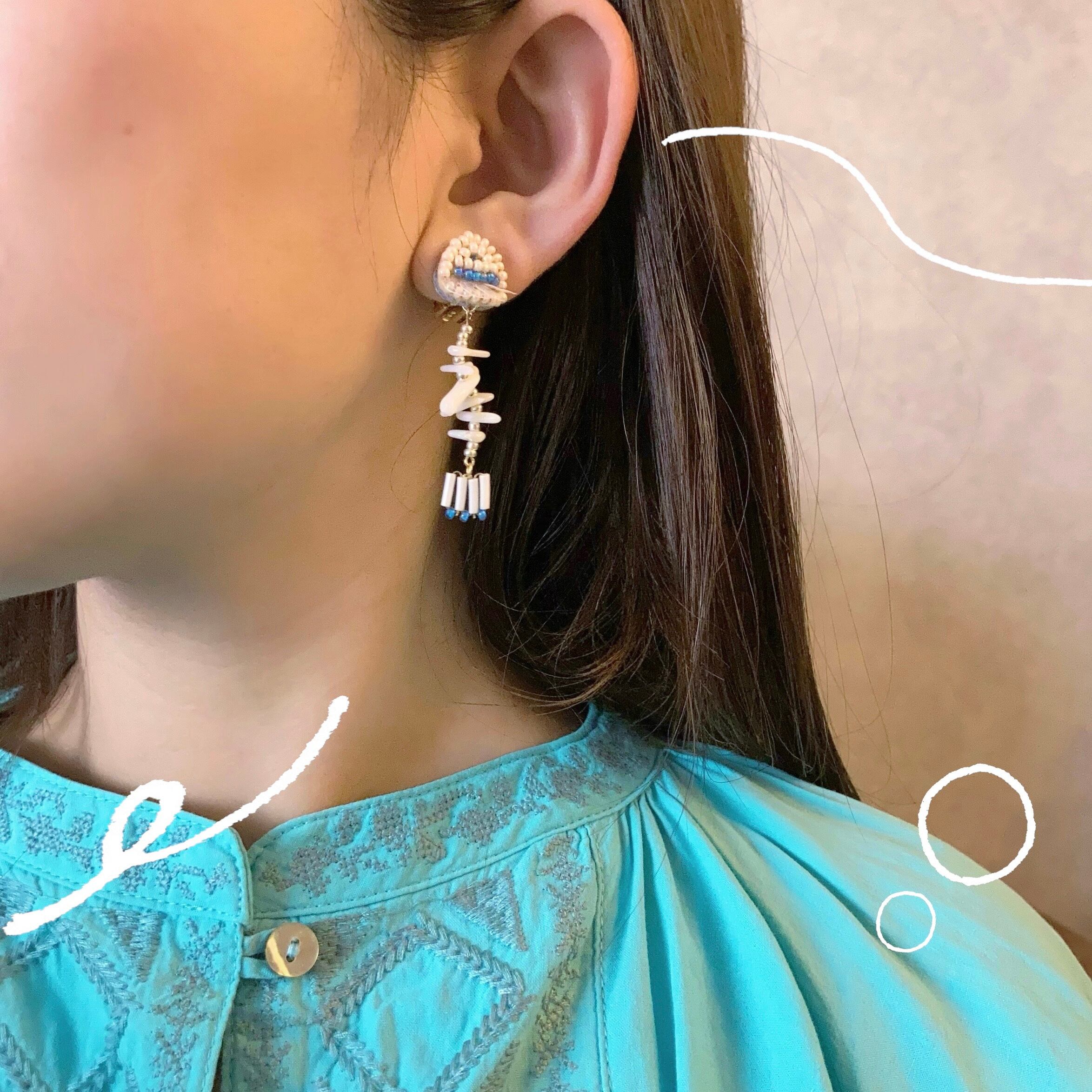 多様な素材を組み合わせてつくられた耳飾りです。