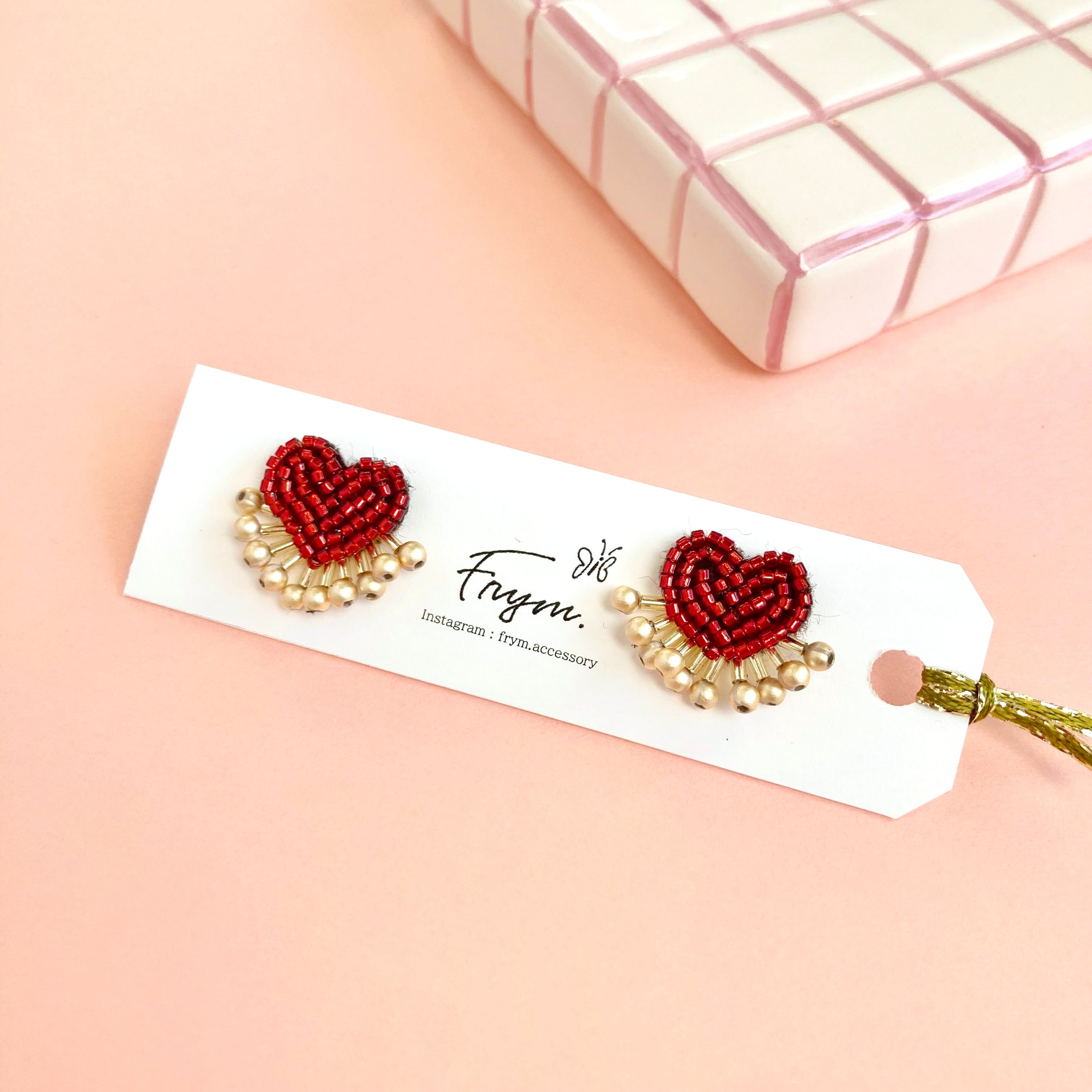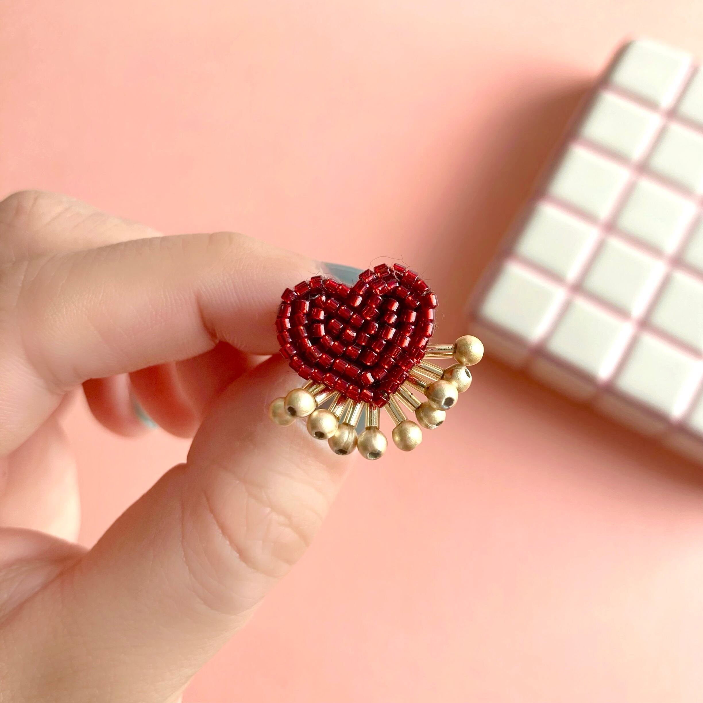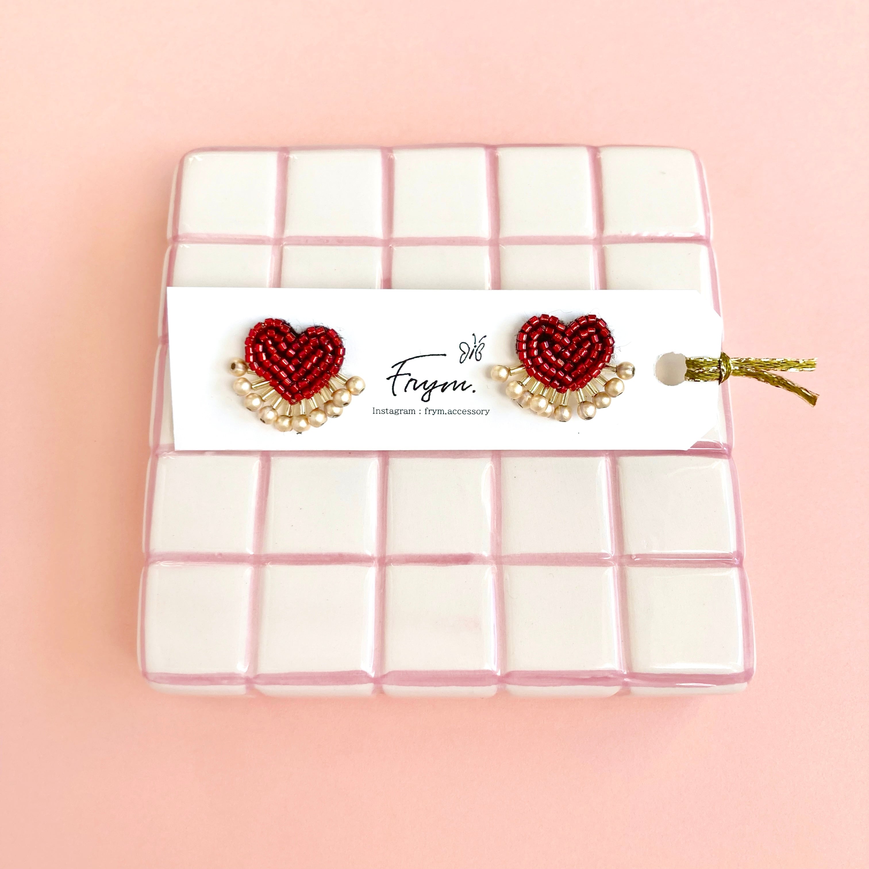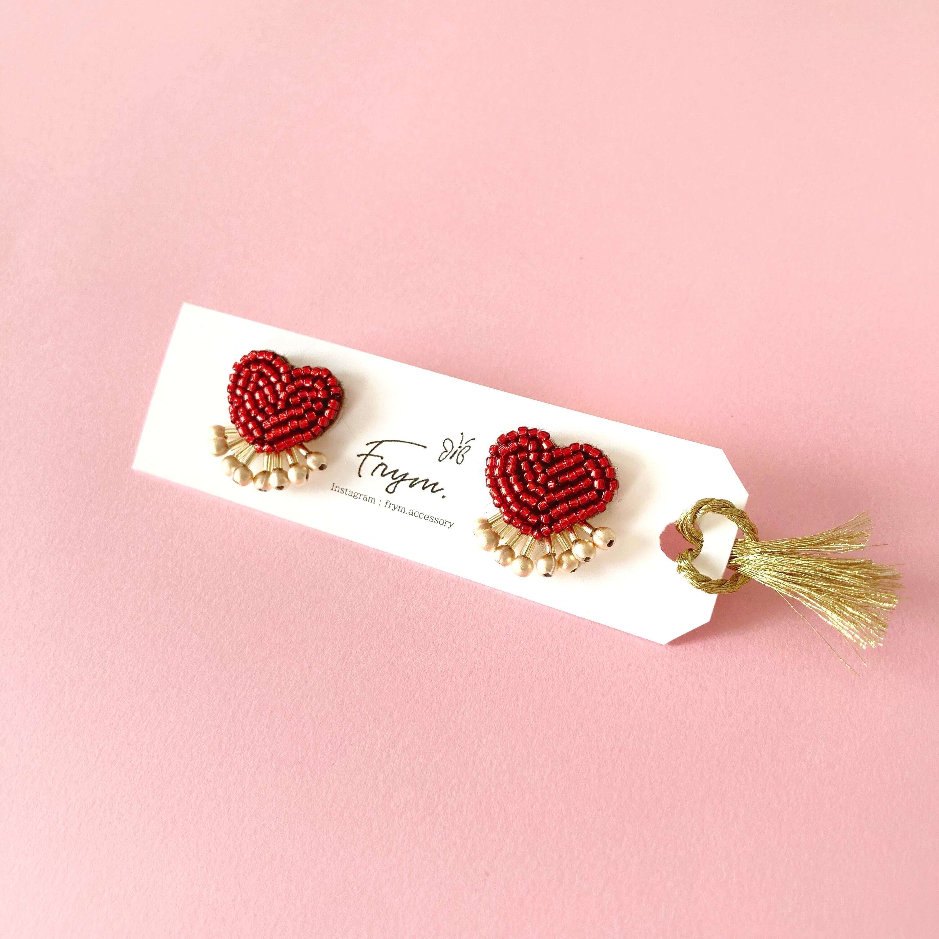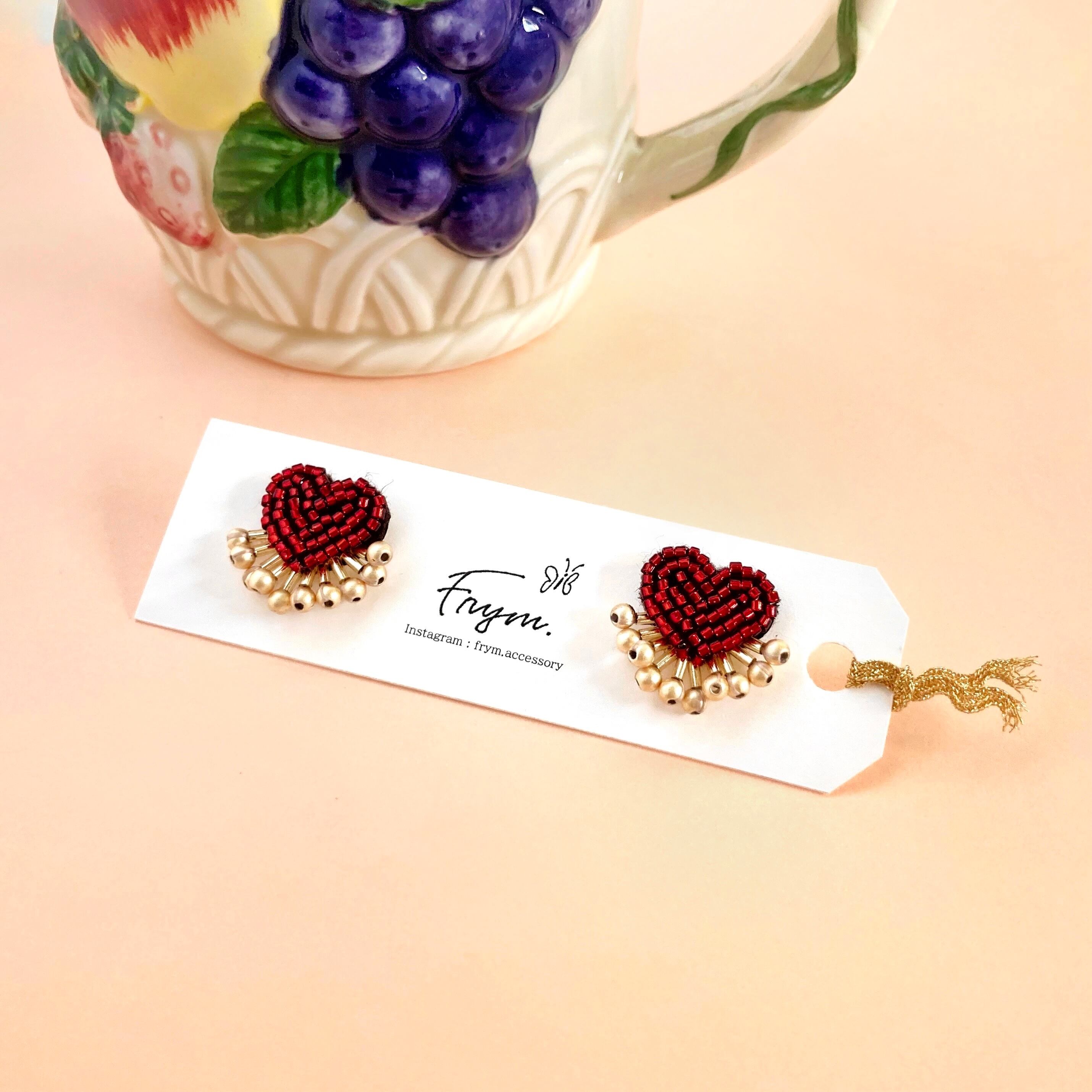 ビーズ刺繍でつくられたハートモチーフの耳飾り。