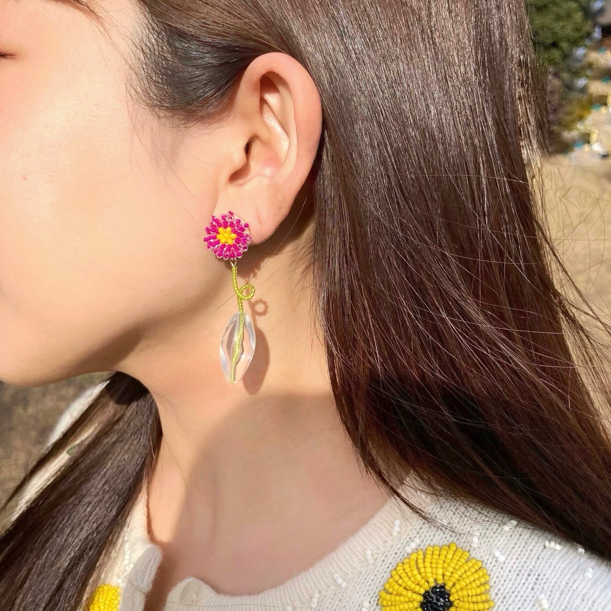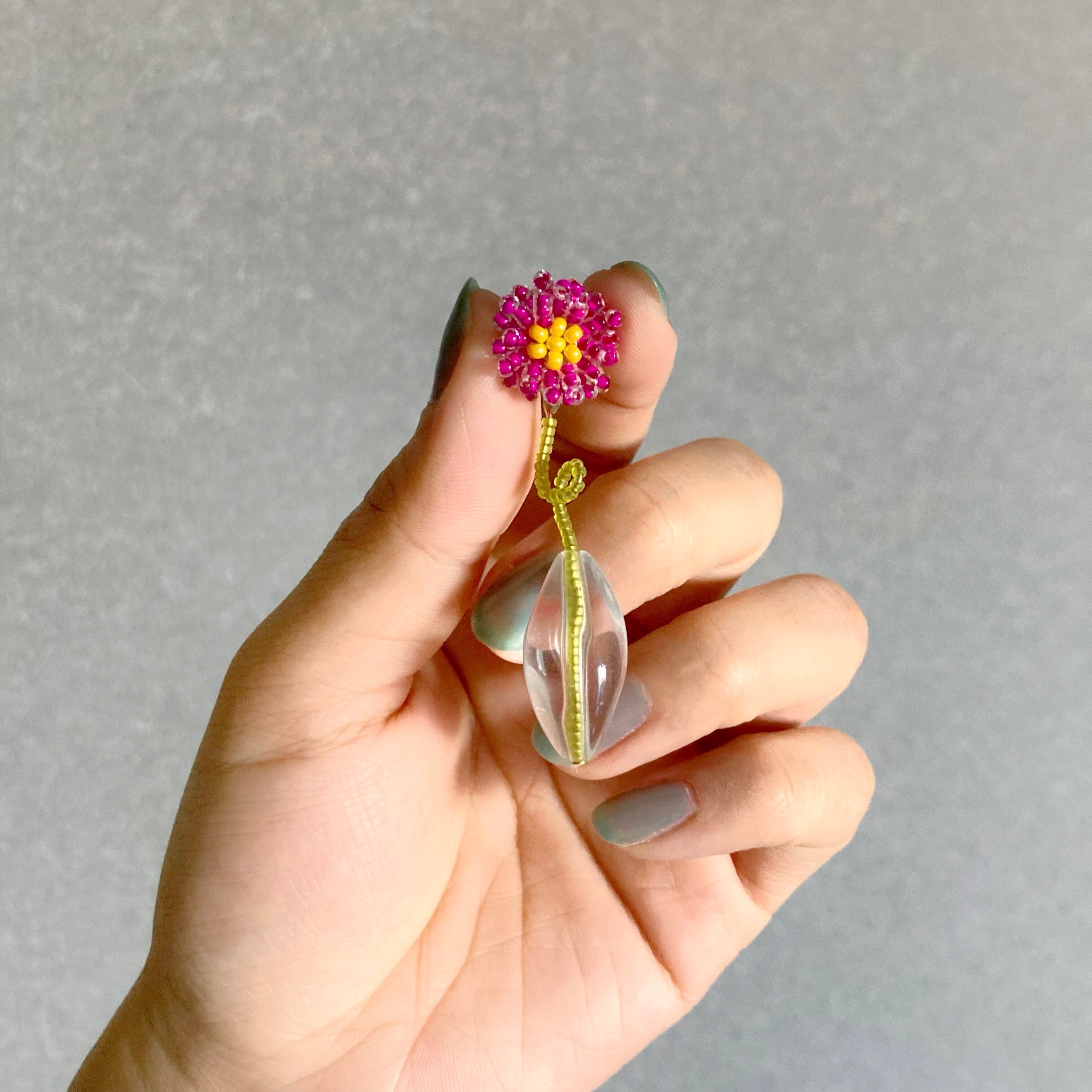 ビーズ刺繍のお花を挿した一輪挿しの耳飾り。