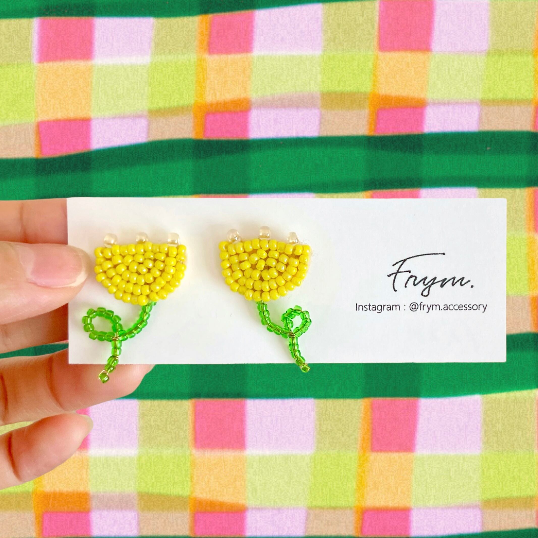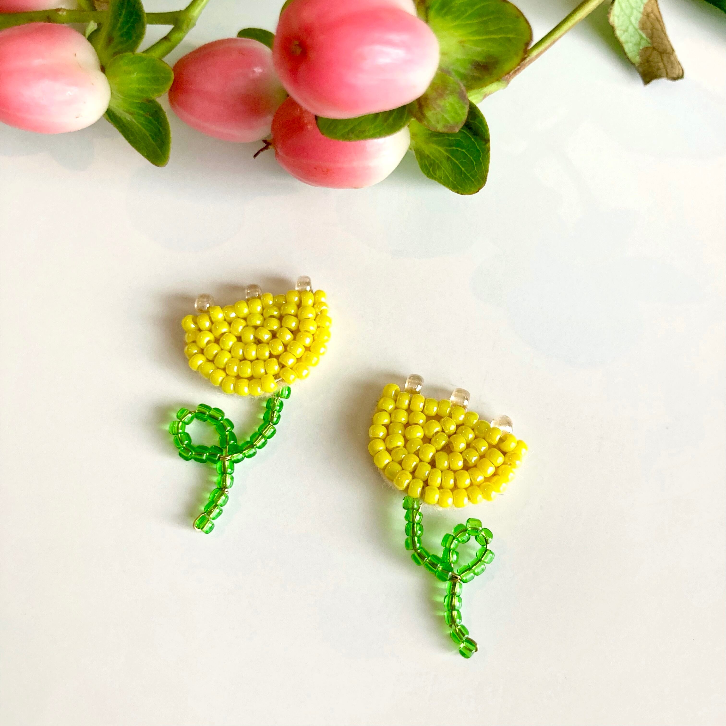 チューリップのビーズ刺繍耳飾り Yellow
