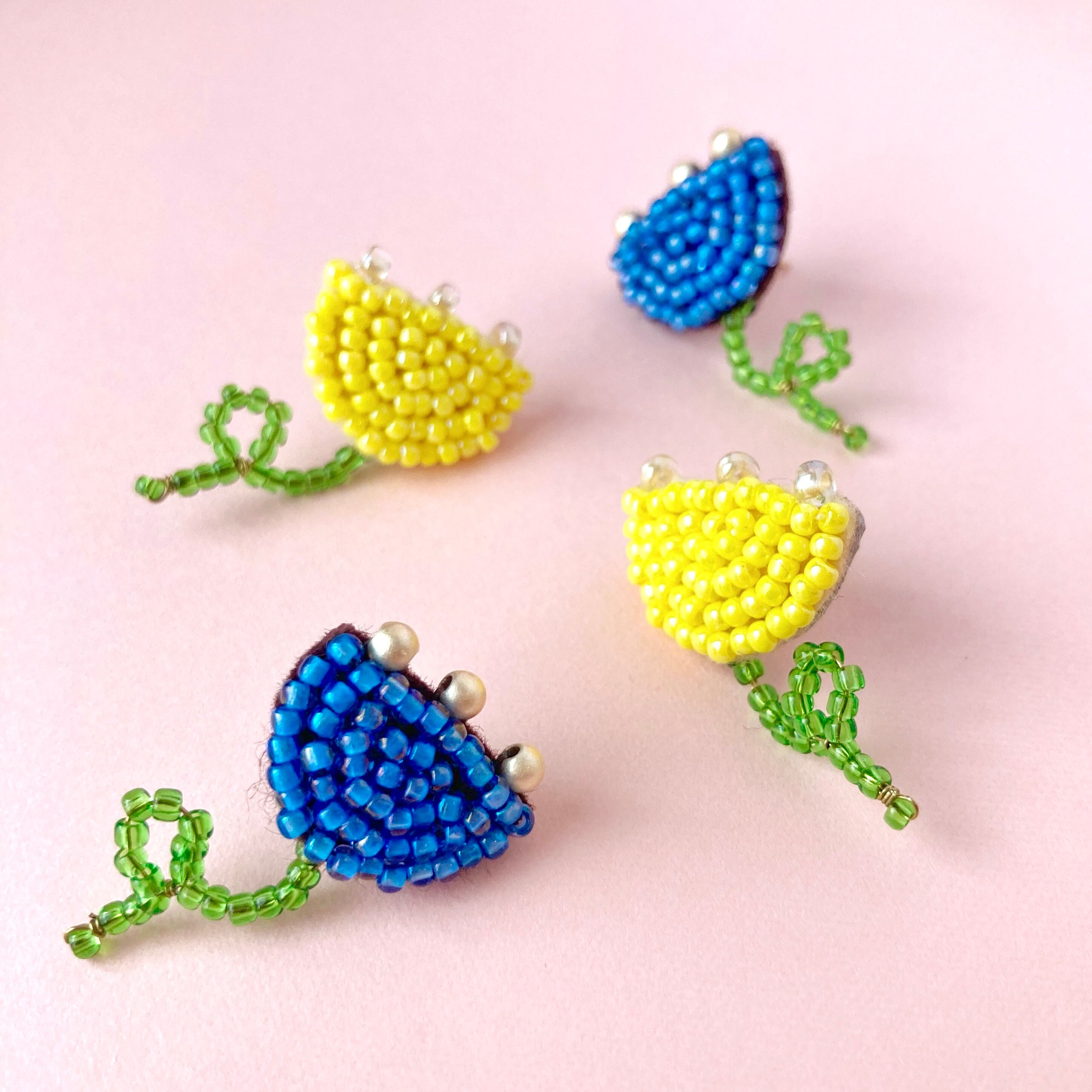チューリップのビーズ刺繍耳飾り。